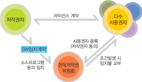 | 저작권자와 사용권자가 소스프로그램 등을 위원회에 임치한 후 저작권자 폐업 등 조건 발생 시 사용권자에게 임치물을 교부 | 저작권자가 사용권자를 위하여 소스프로그램 등을 위원회에 임치한 후 저작권자 폐업 등 조건 발생 시 등록된 사용권자에게 임치물을 교부 |