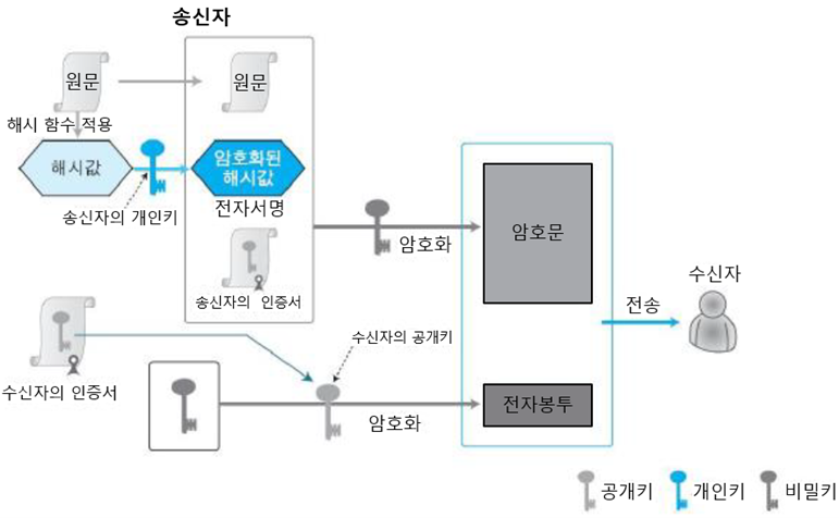 | 2단계 | 비밀키로 암호화 (암호문 생성) | – 원문과 송신자의 개인키를 이용하여 생성한 전자서명, 송신자의 공개키가 들어있는 인증서(송신자의 인증서)를 비밀키를 사용하여 암호화 |
