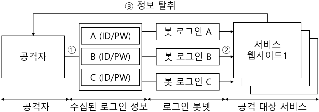 | 개념 | 다크웹이나 해킹으로 수집한 인증정보를 통한 다수 웹사이트 대상 봇넷 자동화 기반 Brute Force 로그인 시도 공격 |