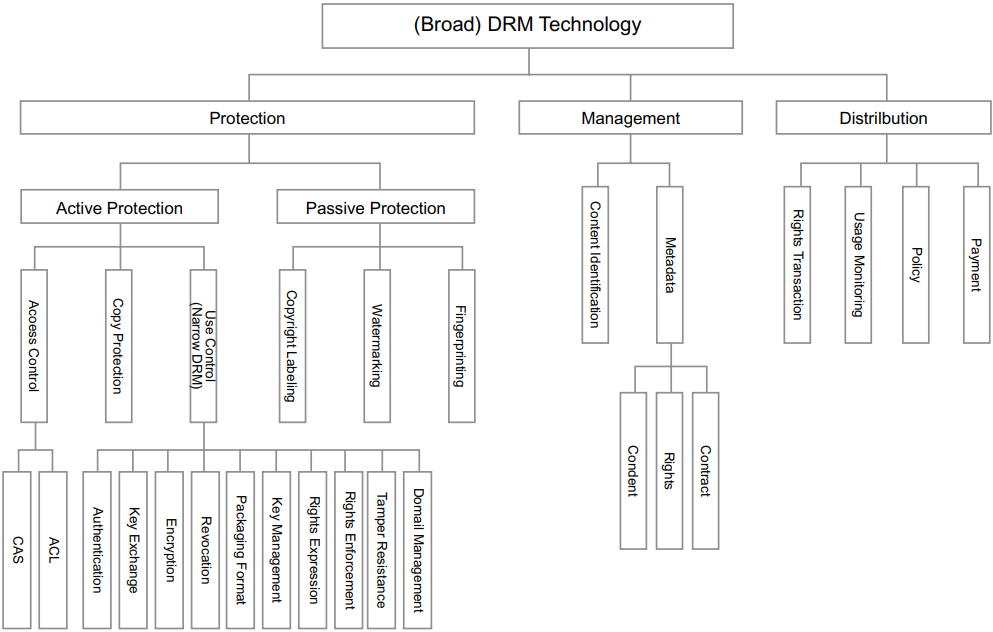 | 협의적 개념 | 지적재산권 침해로부터 저작물 보호 위해 디지털콘텐츠 암호화 패키징, 라이센스 관리, 권한 통제 기반 저작권 보호 기술 |