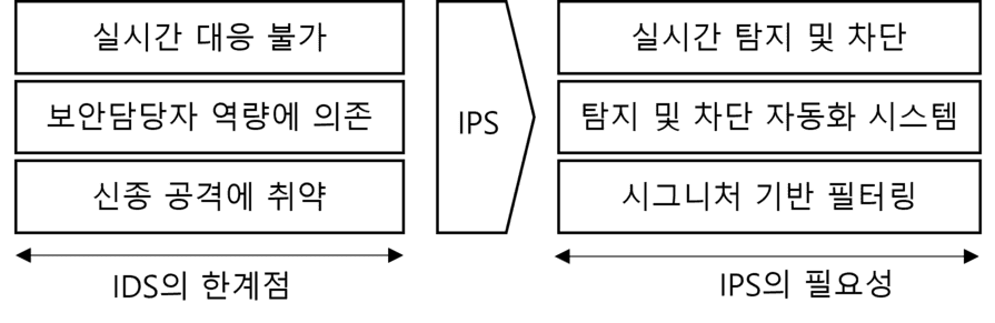 - IPS는 IDS를 기반으로 출발했지만, 실시간 패킷 처리 속도, 오탐지 최소화, 변경/오용 공격 탐지, 상황 별 실시간 반응 등 차이점 존재